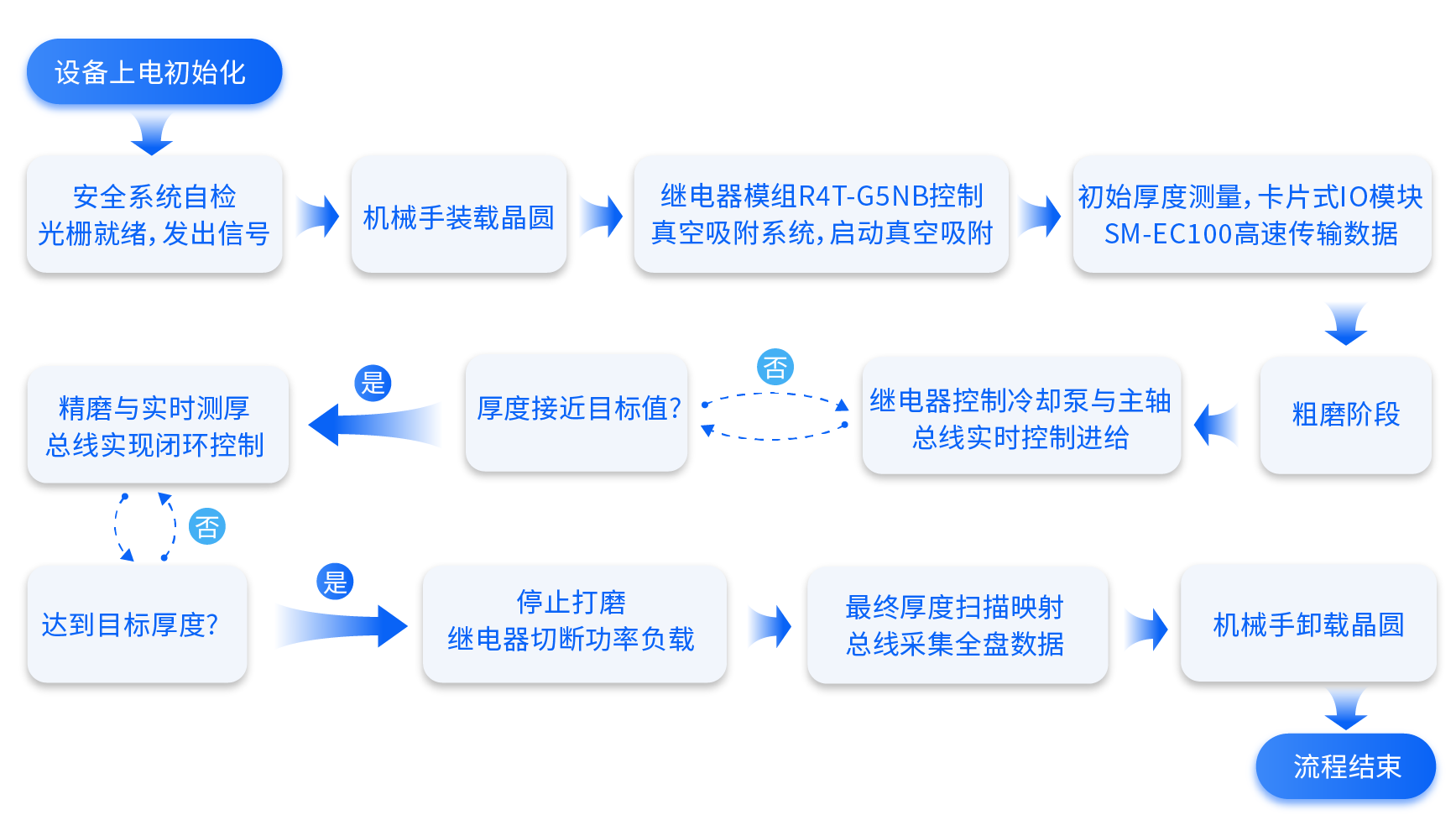 Q:微米级精度下的控制延迟挑战:厚度控制公差需保持在微米级别,这对控制系统的实时性和同步性提出了极致要求。任何信号传输延迟都可能导致打磨头进给与测厚反馈节拍失步,造成厚度超差或晶圆过磨。